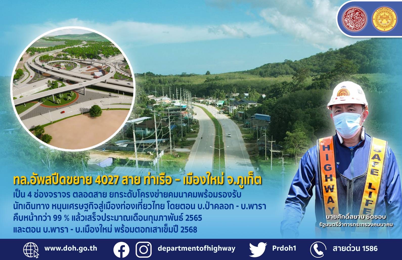 นายสราวุธ ทรงศิวิไล อธิบดีกรมทางหลวง เปิดเผยว่า นายศักดิ์สยาม ชิดชอบ รัฐมนตรีว่าการกระทรวงคมนาคม ได้ติดตามและเร่งรัดให้ดำเนินโครงการที่อยู่ระหว่างการก่อสร้างในพื้นที่จังหวัดภูเก็ตให้แล้วเสร็จทันตามกำหนด โดยขณะนี้ทางหลวงสาย 4027 ตอน บ.ป่าคลอก- บ.พารา คืบหน้ากว่า 99 % แล้วเสร็จประมาณเดือนกุมภาพันธ์ ปี 2565 และตอน บ.พารา-บ.เมืองใหม่ พร้อมตอกเสาเข็มปี 2568 เพื่อยกระดับโครงข่ายคมนาคมและการพัฒนาเมือง รวมทั้งช่วยส่งเสริมการท่องเที่ยว กระตุ้นเศรษฐกิจและยกระดับคุณภาพชีวิตประชาชน เนื่องจากจังหวัดภูเก็ตเป็นเมืองที่สวยงามได้สมญานามไข่มุกแห่งอันดามันเป็นแหล่งท่องเที่ยวที่มีชื่อเสียงระดับโลก มีนักท่องเที่ยวมาเยือนจำนวนมาก สร้างรายได้ให้ภูเก็ตและประเทศไทยปีละหลายแสนล้าน รวมทั้งทางหลวงหมายเลข 402 สายโคกกลอย-เมืองภูเก็ต ที่เป็นทางหลวงสายหลักเพียงเส้นเดียวมีปริมาณจราจรใกล้เต็มความจุของถนนจึงต้องหาโครงข่ายทางหลวงมารองรับปริมาณจราจร ภาครัฐจึงเห็นว่าทางหลวงหมายเลข 4027 สามารถรองรับปริมาณจราจรจากทางหลวงหมายเลข 402 ได้ รวมทั้งเชื่อมต่อไปยัง ท่าอากาศยานภูเก็ต ท่าเรืออ่าวปอ ท่าเรือบางโรง และสถานที่ท่องเที่ยวในจังหวัดภูเก็ต เพื่อให้นักท่องเที่ยวเดินทางได้อย่างสะดวกรวดเร็วปลอดภัยตามนโยบายของรัฐบาล รัฐมนตรีว่าการกระทรวงคมนาคมจึงผลักดันให้ขยายเส้นทางหลวงหมายเลข 4027 สาย ท่าเรือ – เมืองใหม่ พื้นที่อำเภอถลาง จังหวัดภูเก็ต จาก 2 ช่องจราจร เป็น 4 ช่องจราจร โดยที่ผ่านมากรมทางหลวงได้ดำเนินโครงการพัฒนาทางหลวงสาย 4027 ตอน บ.ท่าเรือ-ป่าคลอก ระหว่าง กม.0+000 - กม.5+900 ระยะทาง 5.9 กิโลเมตร แล้วเสร็จและเปิดให้ใช้บริการเพื่ออำนวยความสะดวกแก่ประชาชนผู้ใช้ทางไปแล้ว โดยเหลือเพียง 2 ตอนคือ ตอน ตอน บ.ป่าคลอก - บ.พารา ขณะนี้อยู่ระหว่างดำเนินการก่อสร้าง และตอน บ.พารา-บ.เมืองใหม่ อยู่ในขั้นตอนการสำรวจและออกแบบ ดังนี้ ตอน บ.ป่าคลอก-บ.พารา ระยะทาง 8.4 กิโลเมตร มีจุดเริ่มต้นโครงการที่ กม.5+900 สิ้นสุดที่ กม. 14+300 ได้รับงบประมาณก่อสร้างปี 2562 วงเงิน 384.16 ล้านบาท ปัจจุบันสำนักก่อสร้างทางที่ 1 ได้เร่งดำเนินก่อสร้างทางหลายช่วงดังกล่าว โดย ก่อสร้างเป็นมาตรฐานทางชั้นพิเศษ 4 ช่องจราจร ผิวทางคอนกรีต ความกว้างช่องจราจรละ 3.5 เมตร ไหล่ทางกว้างข้างละ 2.5 เมตร ภายในเขตทาง 40 เมตร มีเกาะกลางเพื่อใช้เป็นจุดกลับรถทั้งหมด 5 แห่งคือ ระดับพื้น 2 แห่ง ใต้สะพาน 2 แห่ง และทางแยกสัญญาณไฟ 1 แห่ง พร้อมติดตั้งไฟฟ้าแสงสว่างตลอดเส้นทาง งบประมาณโครงการ 384,161,425 ล้านบาท ปัจจุบันการก่อสร้างคืบหน้าประมาณ