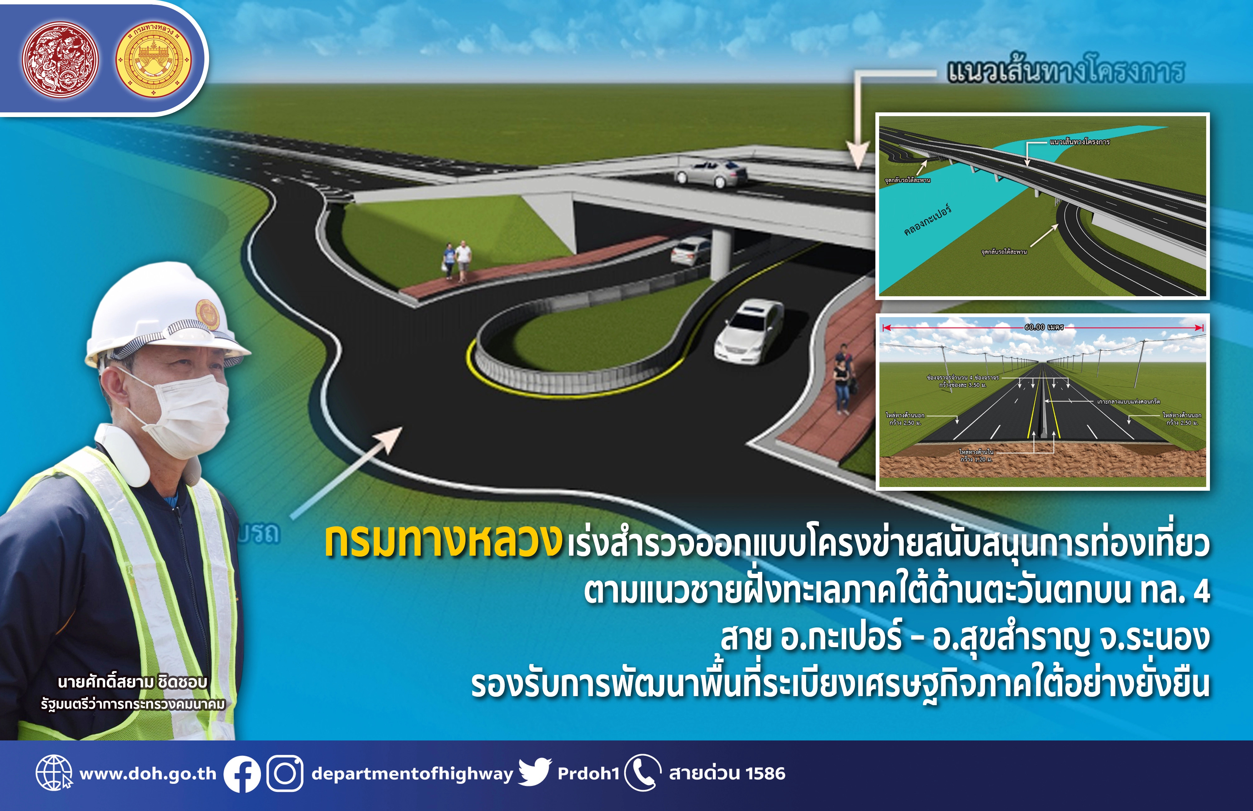 นายสราวุธ ทรงศิวิไล อธิบดีกรมทางหลวง เปิดเผยว่า ตามที่นายศักดิ์สยาม ชิดชอบ รัฐมนตรีว่าการกระทรวงคมนาคมได้มอบนโยบายผลักดันให้กรมทางหลวงเร่งดำเนินโครงการสำรวจและออกแบบเพื่อพัฒนาโครงสร้างพื้นฐานด้านคมนาคมทุกมิติ ยกระดับถนนด้านความปลอดภัยและเชื่อมโยงโครงข่ายคมนาคม อีกทั้งยังขับเคลื่อนเศรษฐกิจการท่องเที่ยวและยกระดับคุณภาพชีวิตของประชาชน พร้อมเร่งรัดให้กรมทางหลวงดำเนินโครงการสำรวจและออกแบบโครงข่ายสนับสนุนการท่องเที่ยวตามแนวชายฝั่งทะเลภาคใต้ด้านตะวันตกบนทางหลวงหมายเลข 4 สาย อ.กะเปอร์ – อ.สุขสำราญ