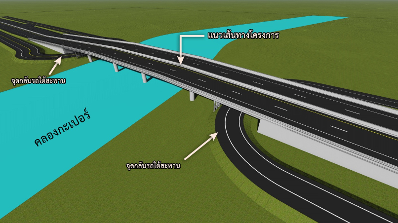 - รูปแบบที่ 2 รูปแบบจุดกลับรถใต้สะพานข้ามคลอง จำนวน 13 แห่ง โดยรูปแบบนี้จะเป็นการก่อสร้างจุดกลับรถใต้สะพานข้ามคลอง ซึ่งจะช่วยให้ประชาชนในท้องถิ่นใช้ระบบกลับรถในโครงการให้มีความปลอดภัยขึ้น