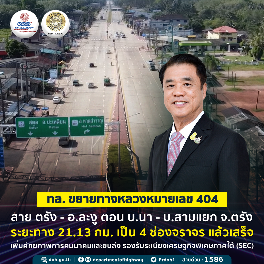 กรมทางหลวง ขยายทางหลวงหมายเลข 404 สาย ตรัง - อ.ละงู ตอน บ.นา - บ.สามแยก จ.ตรัง ระยะทาง21.13 กิโลเมตร เป็น 4 ช่องจราจร แล้วเสร็จ เพิ่มศักยภาพการคมนาคมและขนส่ง รองรับระเบียงเศรษฐกิจพิเศษภาคใต้ (SEC)