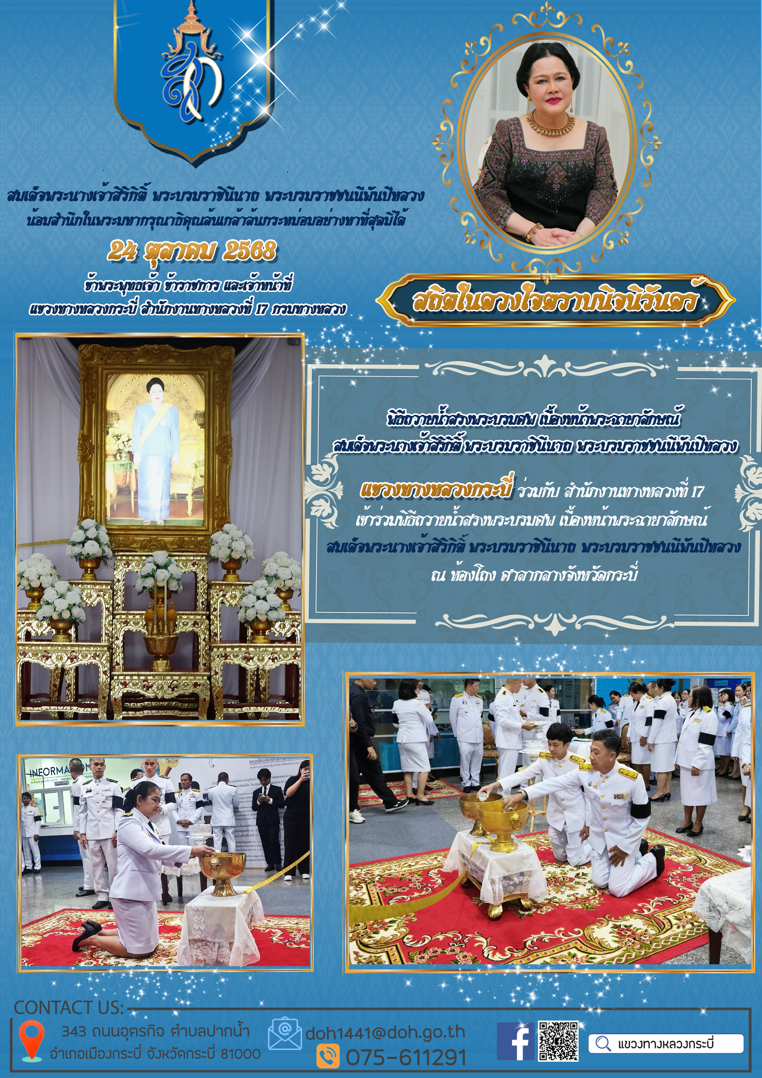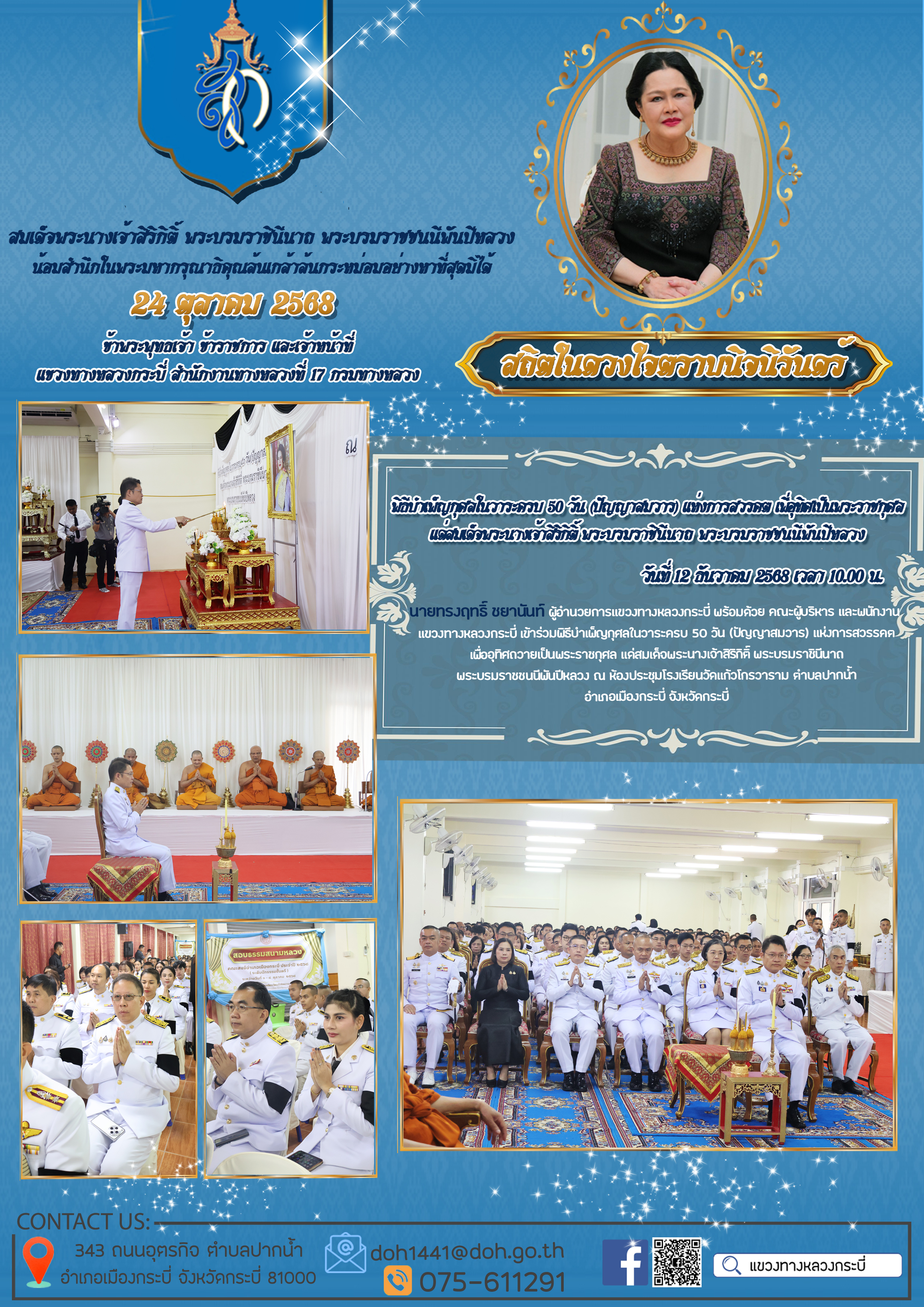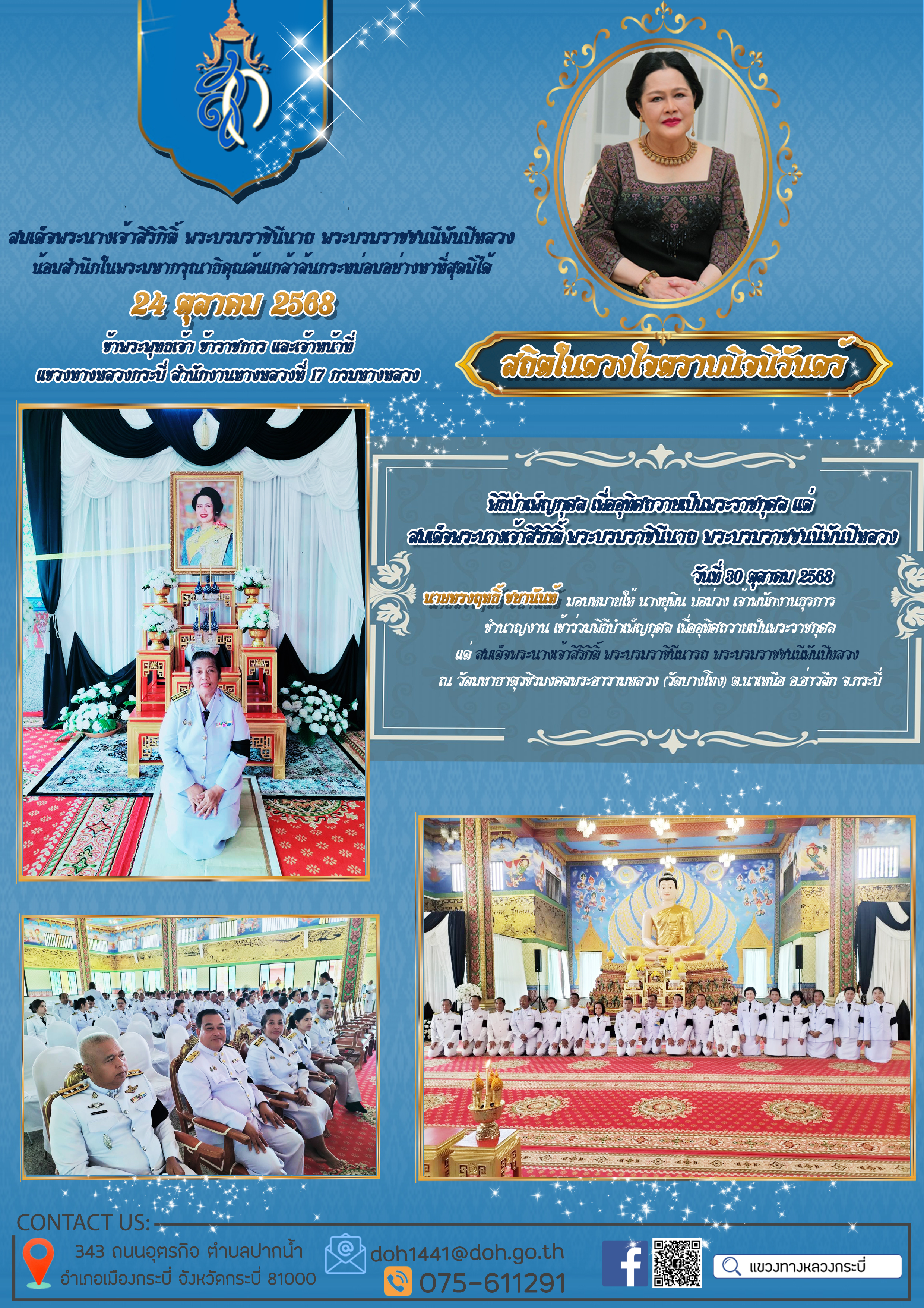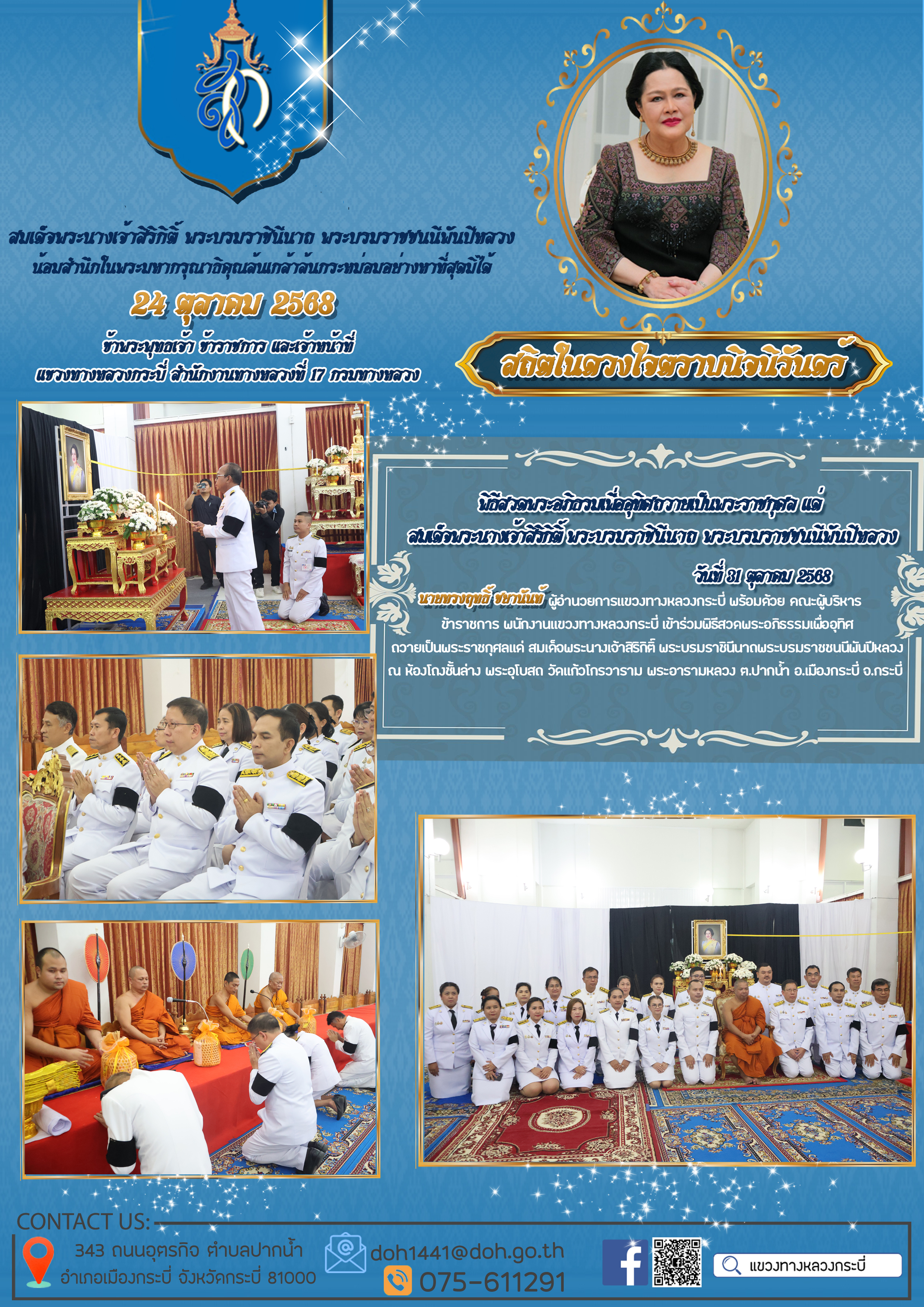 11 24/11/2568 แขวงทางหลวงกระบี่ ร่วมกับหน่วยงานในสังกัดกระทรวงคมนาคมเป็นเจ้าภาพในการประกอบพิธีธรรมสวดพระอภิธรรม เพื่ออุทิศถวายพระราชกุศลแด่สมเด็จพระนางเจ้าสิริกิติ์ พระบรมราชินีนาถ พระบรมราชชนนีพันปีหลวง