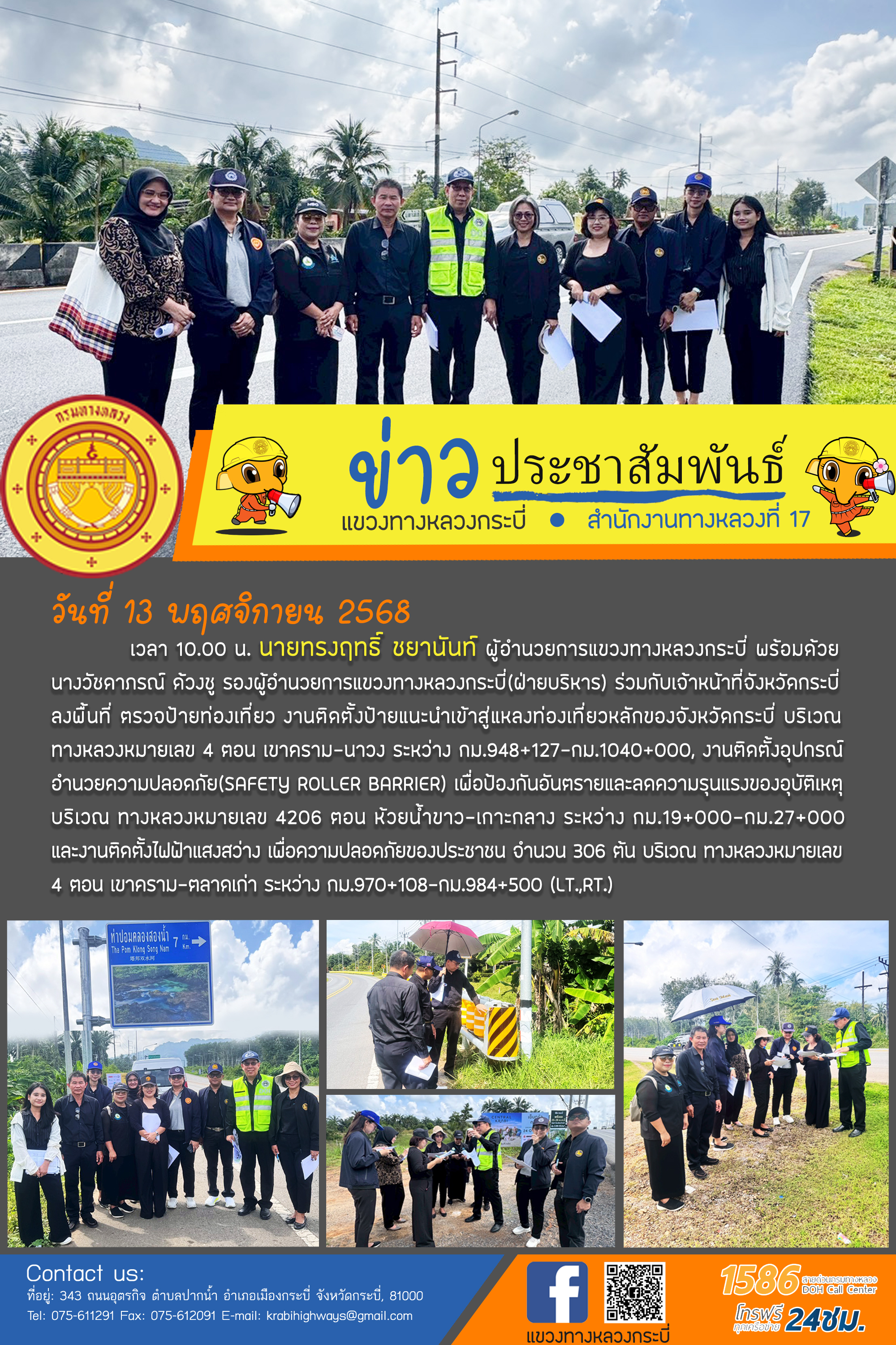 12 13/11/2568 ผู้อำนวยการแขวงทางหลวงกระบี่ลงพื้นที่ ตรวจป้ายท่องเที่ยวร่วมกับจังหวัดกระบี่