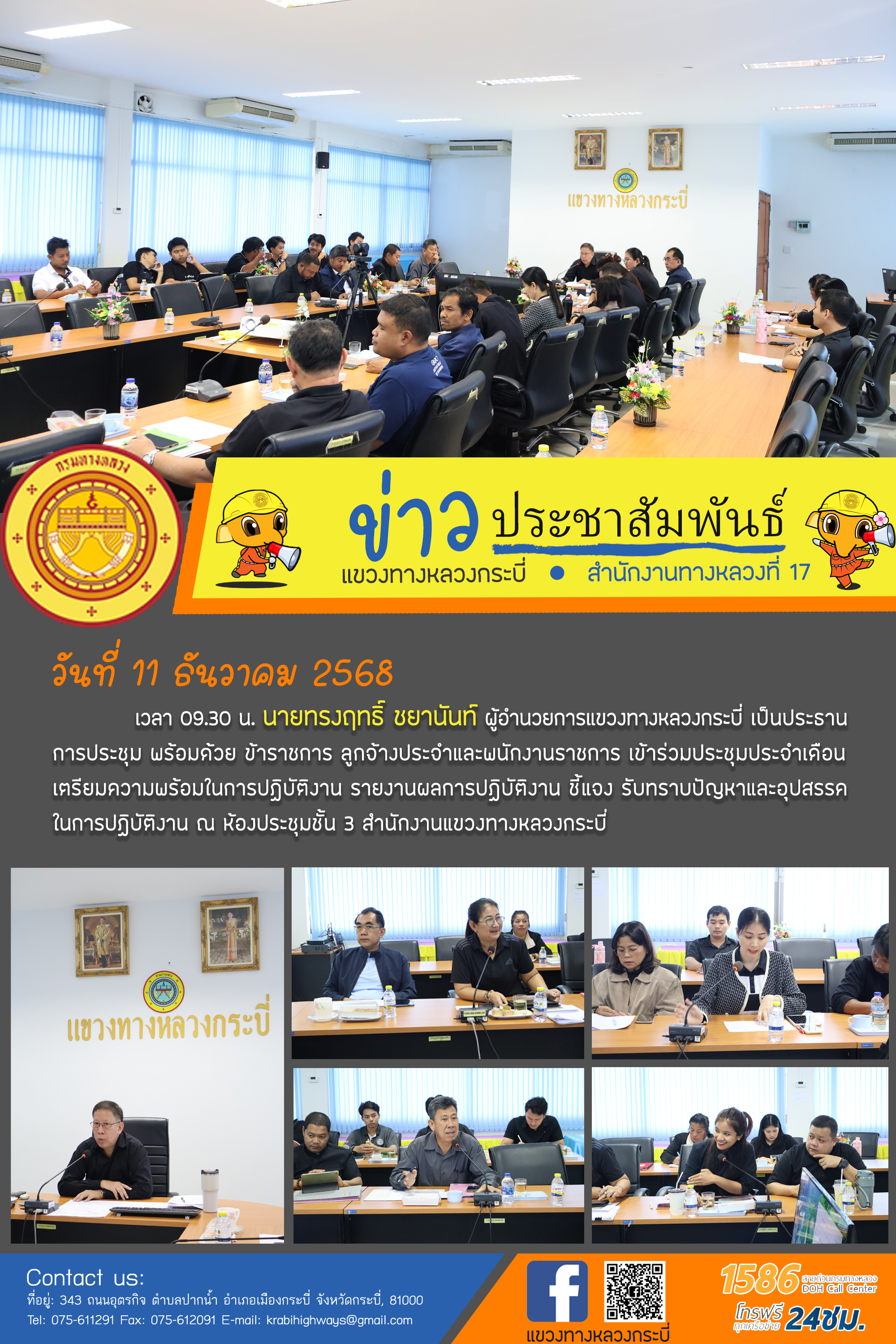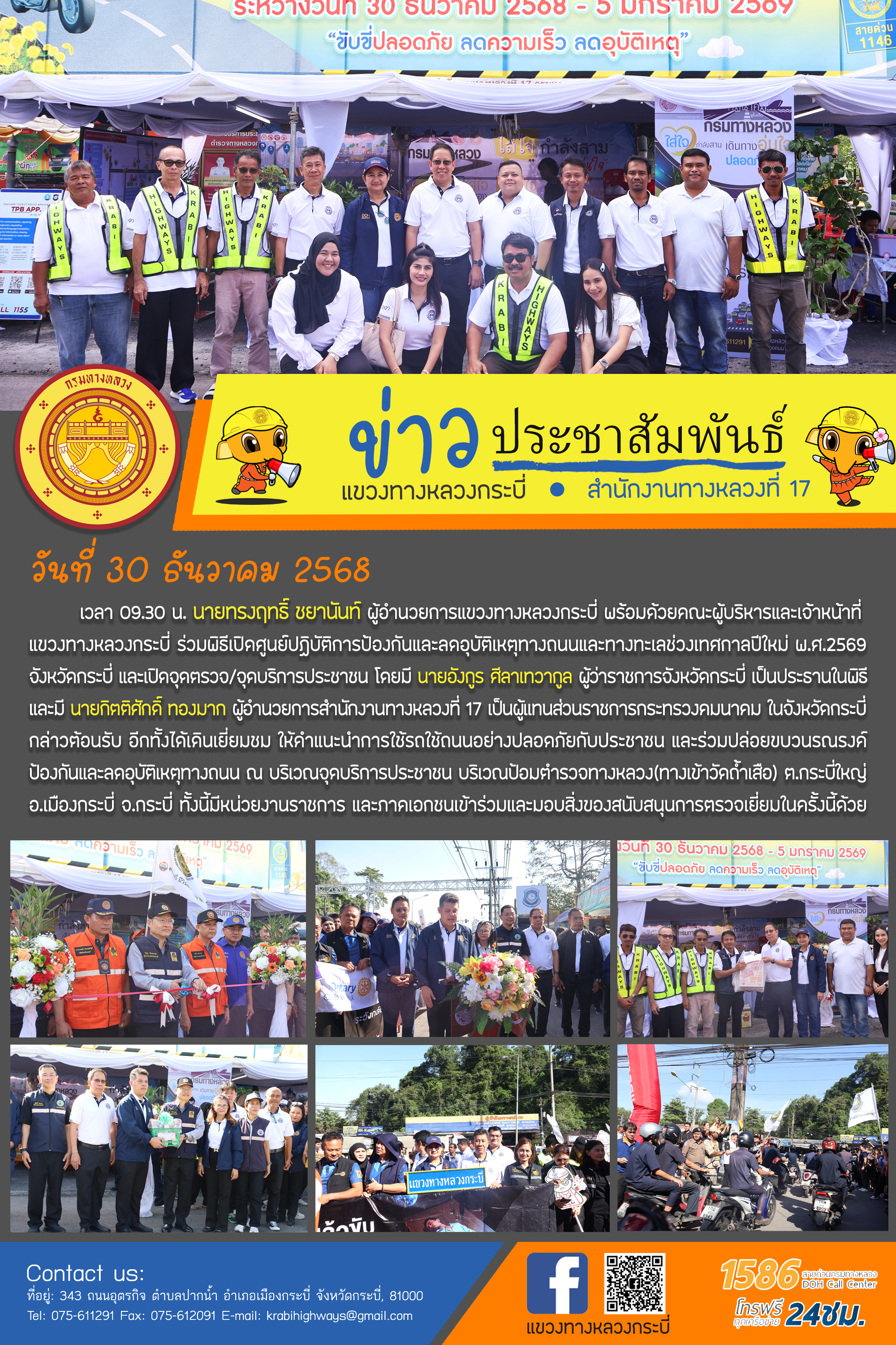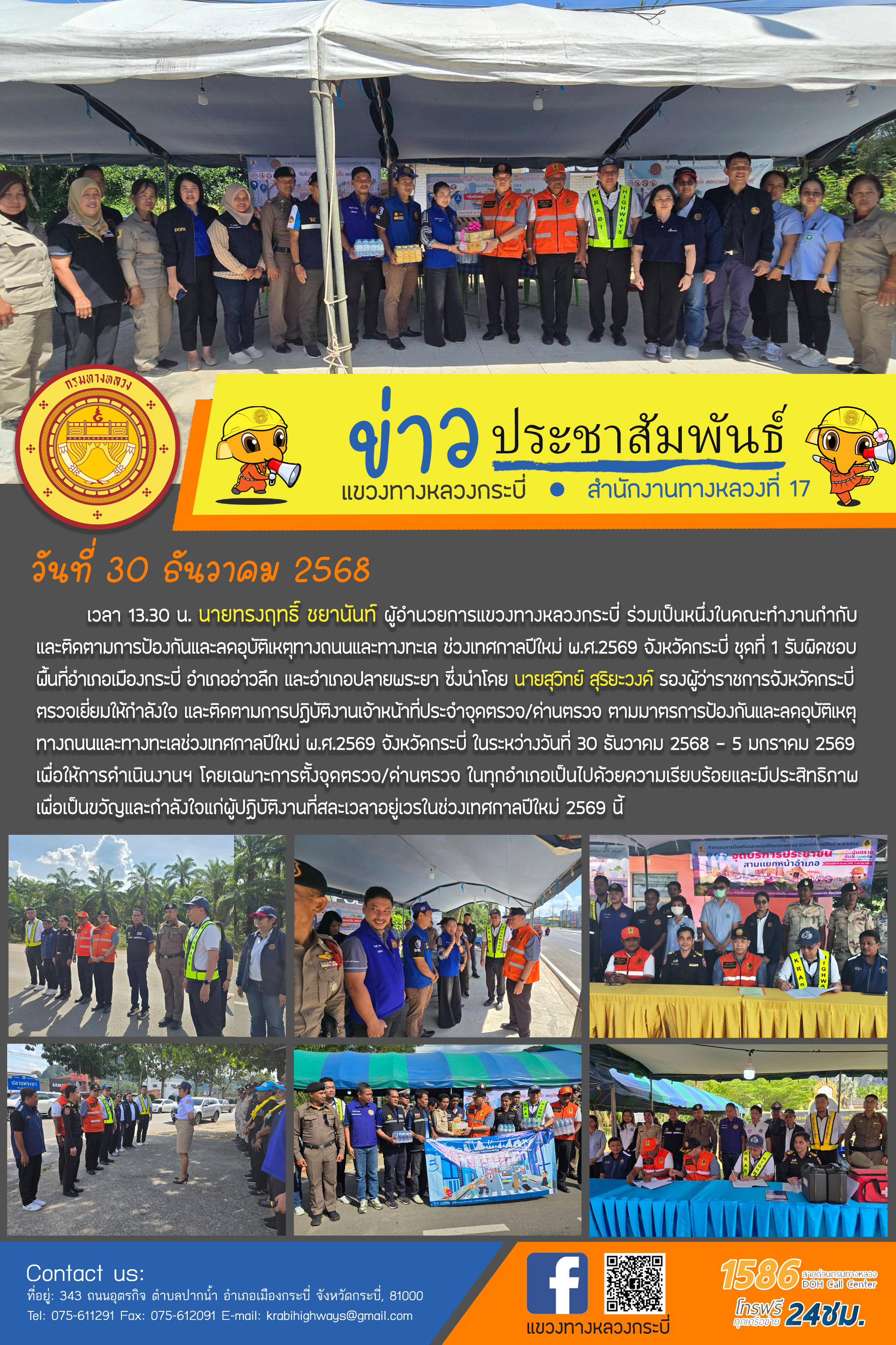 5 30/12/2568 แขวงทางหลวงกระบี่ ร่วมเป็นหนึ่งในคณะทำงานกำกับ และติดตามการป้องกันและลดอุบัติเหตุทางถนนและทางทะเล ช่วงเทศกาลปีใหม่ พ.ศ.2569