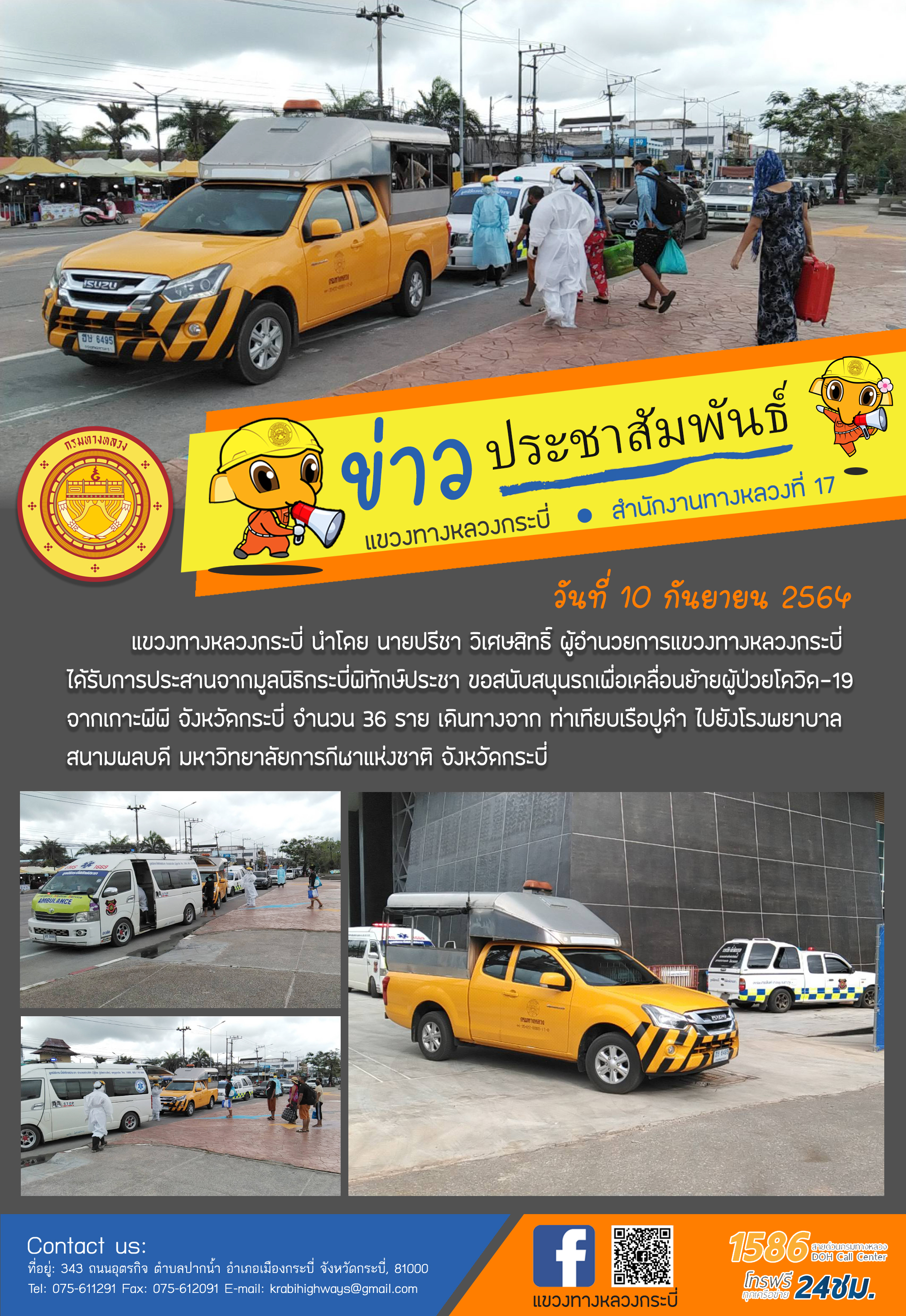แขวงทางหลวงกระบี่สนับสนุนรถเคลื่อนย้ายผู้ป่วยโควิด-19 จากเกาะพีพีไปยังโรงพยาบาลสนามจังหวัดกระบี่