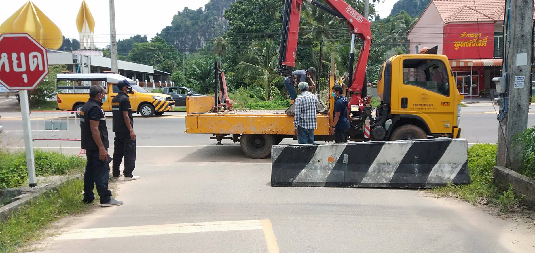 แขวงทางหลวงกระบี่นำแบริเออร์คอนกรีตปิดกั้นการสัญจรเข้าออกหมู่บ้านหมู่ที่ 1 บ้านช่องพลี เนื่องจากมีจำนวนผู้ติดเชื้อโควิด-19