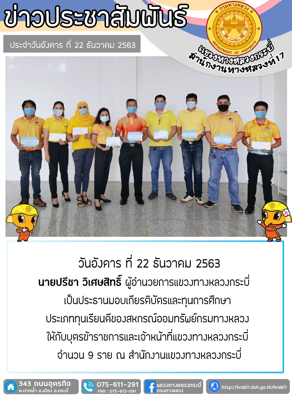 ผู้อำนวยการสำนักงานทางหลวงที่ 17 พร้อมด้วยคณะเข้าตรวจเยี่ยมและมอบสิ่งของเพื่อเป็นขวัญกำลังใจให้กับเจ้าหน้าที่แขวงทางหลวงกระบี่