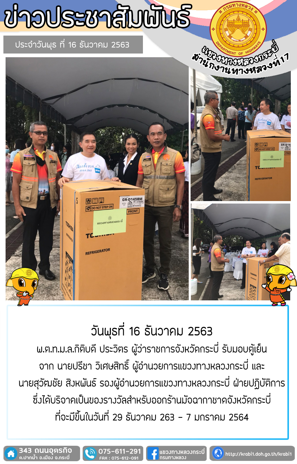 วันพุธที่ 16 ธันวาคม 2563 พ.ต.ท.ม.ล.กิติบดี ประวิตร ผู้ว่าราชการจังหวัดกระบี่ รับมอบตู้เย็น จาก นายปรีชา วิเศษสิทธิ์ ผู้อำนวยการแขวงทางหลวงกระบี่ และ นายสุวัฒชัย สิงหพันธ์ รองผู้อำนวยการแขวงทางหลวงกระบี่ ฝ่ายปฏิบัติการ ซึ่งได้บริจาคเป็นของรางวัลสำหรับออกร้านมัจฉากาชาดจังหวัดกระบี่ ที่จะมีขึ้นในวันที่ 29 ธันวาคม 263 - 7 มกราคม 2564