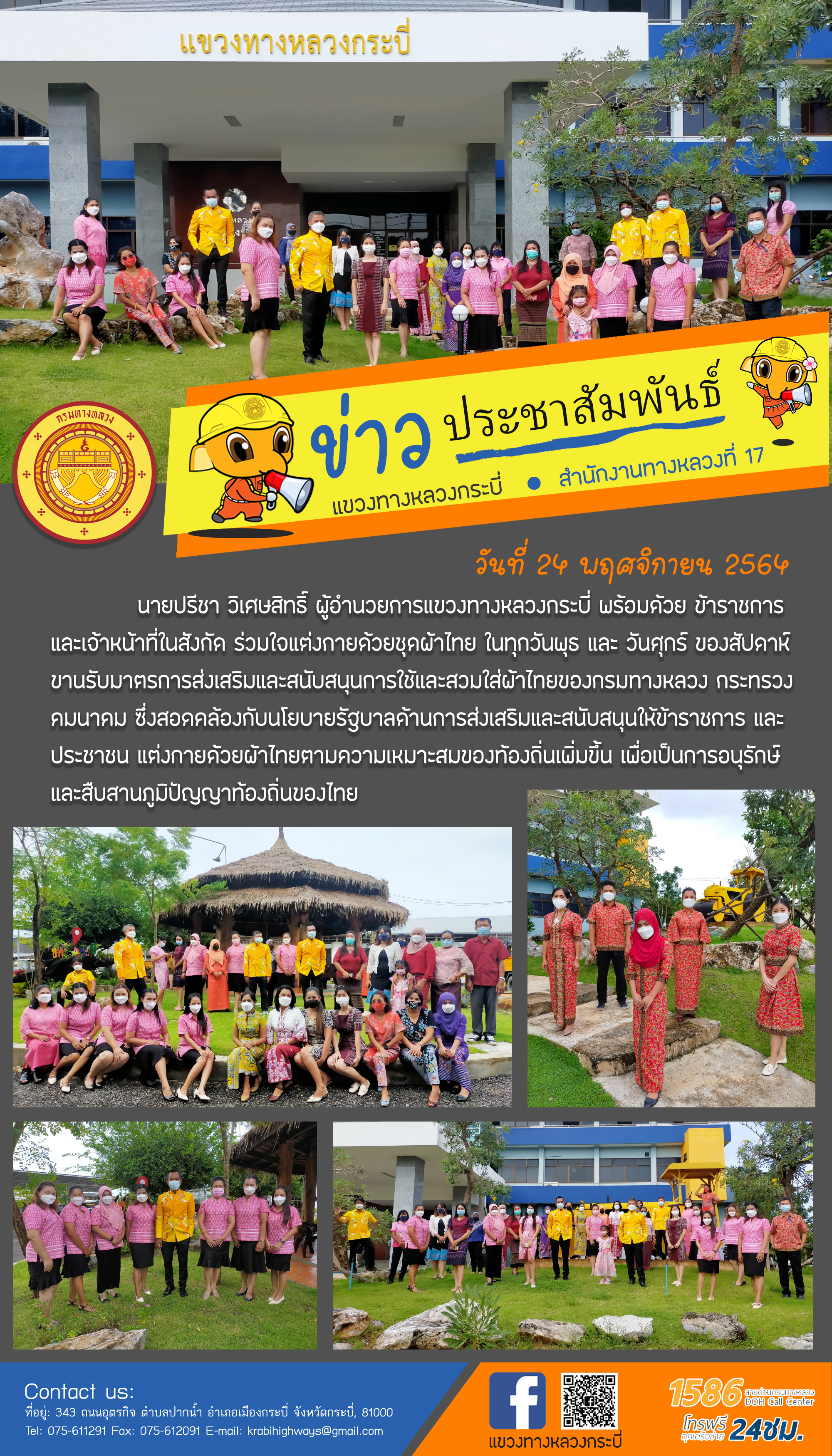 นายปรีชา วิเศษสิทธิ์ ผู้อำนวยการแขวงทางหลวงกระบี่ พร้อมด้วย ข้าราชการ และเจ้าหน้าที่ในสังกัด ร่วมใจแต่งกายด้วยชุดผ้าไทย ในทุกวันพุธ และ วันศุกร์ ของสัปดาห์ ขานรับมาตรการส่งเสริมและสนับสนุนการใช้และสวมใส่ผ้าไทยของกรมทางหลวง กระทรวง คมนาคม ซึ่งสอดคล้องกับนโยบายรัฐบาลด้านการส่งเสริมและสนับสนุนให้ข้าราชการ และประชาชน แต่งกายด้วยผ้าไทยตามความเหมาะสมของท้องถิ่นเพิ่มขึ้น เพื่อเป็นการอนุรักษ์และสืบสานภูมิปัญญาท้องถิ่นของไทย