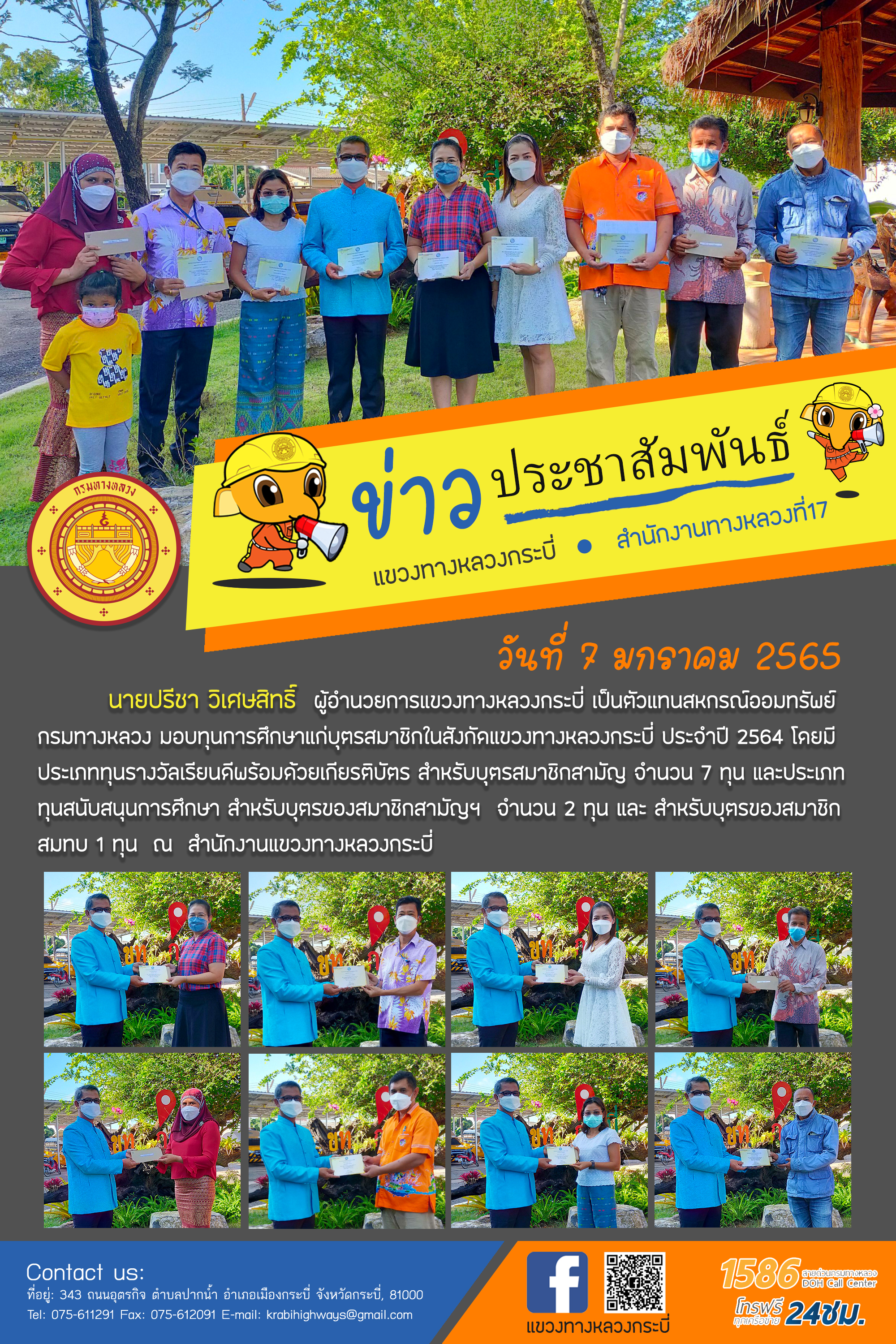 วันที่ 7 มกราคม 2565 เวลา 09.00 น. นายปรีชา วิเศษสิทธิ์ ผู้อำนวยการแขวงทางหลวงกระบี่ เป็นตัวแทนสหกรณ์ออมทรัพย์กรมทางหลวง มอบทุนการศึกษาแก่บุตรสมาชิกในสังกัดแขวงทางหลวงกระบี่ ประจำปี 2564 โดยมีประเภททุนรางวัลเรียนดีพร้อมด้วยเกียรติบัตร สำหรับบุตรสมาชิกสามัญ จำนวน 7 ทุน และประเภททุนสนับสนุนการศึกษา สำหรับบุตรของสมาชิกสามัญฯ จำนวน 2 ทุน และ สำหรับบุตรของสมาชิกสมทบ 1 ทุน ณ สำนักงานแขวงทางหลวงกระบี่