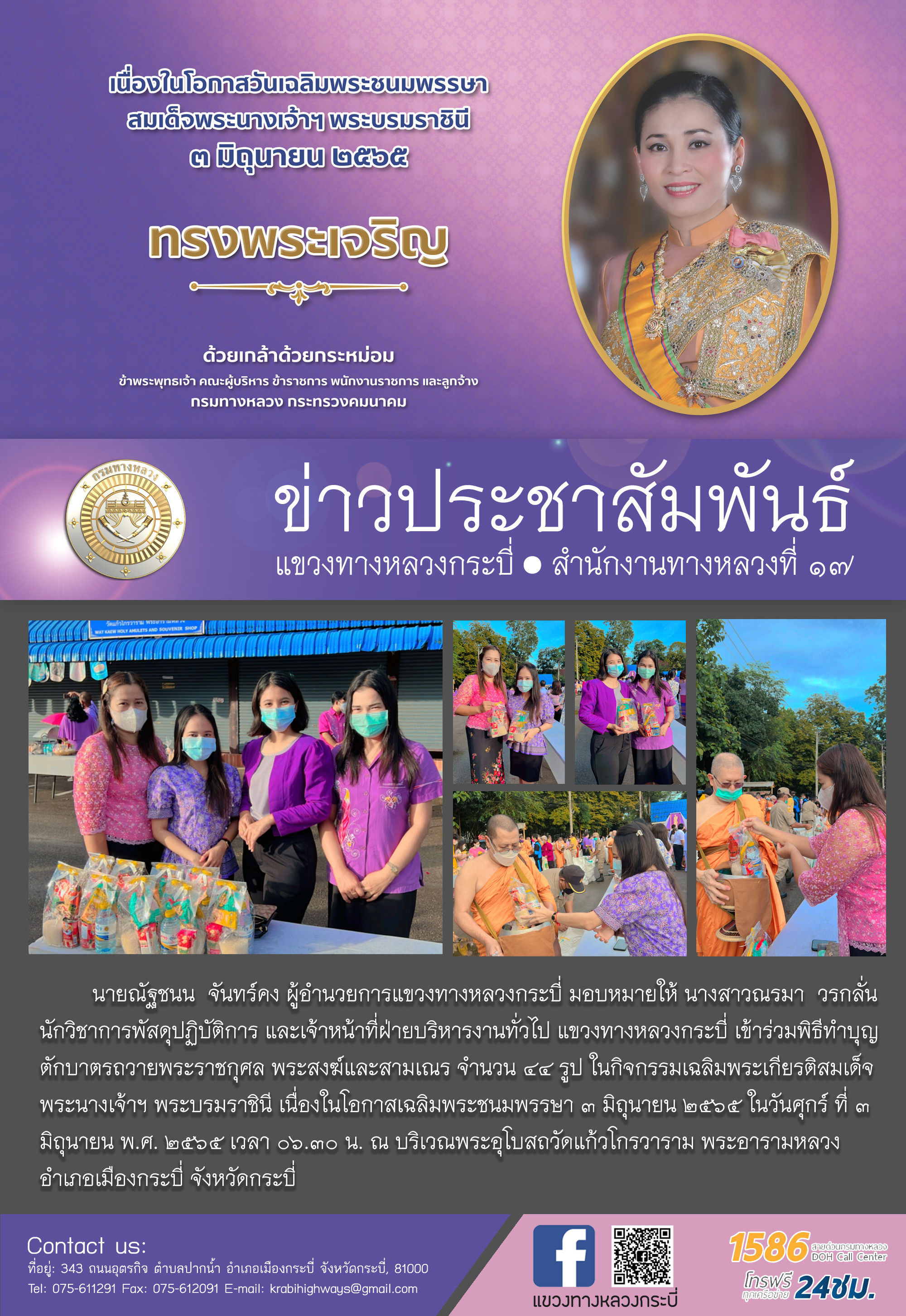 วันที่ 3 มิถุนายน 2565 แขวงทางหลวงกระบี่เข้าร่วมกิจกรรมเฉลิมพระเกียรติสมเด็จพระนางเจ้าฯ พระบรมราชินี เนื่องในโอกาสเฉลิมพระชนมพรรษา 3 มิถุนายน 2565 โดย นายณัฐชนน จันทร์คง ผู้อำนวยการแขวงทางหลวงกระบี่ มอบหมายให้นางสาวณรมา วรกลั่น นักวิชาการพัสดุปฏิบัติการ และเจ้าหน้าที่ฝ่ายบริหารงานทั่วไป แขวงทางหลวงกระบี่ เข้าร่วมพิธีทำบุญ ตักบาตรถวายพระราชกุศล พระสงฆ์และสามเณร จำนวน 44 รูป เวลา 06.30 น. ณ บริเวณพระอุโบสถวัดแก้วโกรวาราม พระอารามหลวง อำเภอเมืองกระบี่ จังหวัดกระบี่ และมอบหมายให้ นายวุฒิพงษ์ สมิหลัง หัวหน้าหมวดทางหลวงทรายขาว, นายอนุวัฒน์ มะศิริ หัวหน้าหมวดทางหลวงเขาพนม และนายสุทธิพงษ์ เพ็งจันทร์ หัวหน้าหมวดทางหลวงอ่าวนาง เข้าร่วมพิธีถวายราชสักการะและวางพานพุ่ม และพิธีจุดเทียนพระพรชัยมงคล เวลา 17.30 น. ณ ห้องประชุมช้างเผือก องค์การบริหารส่วนจังหวัดกระบี่