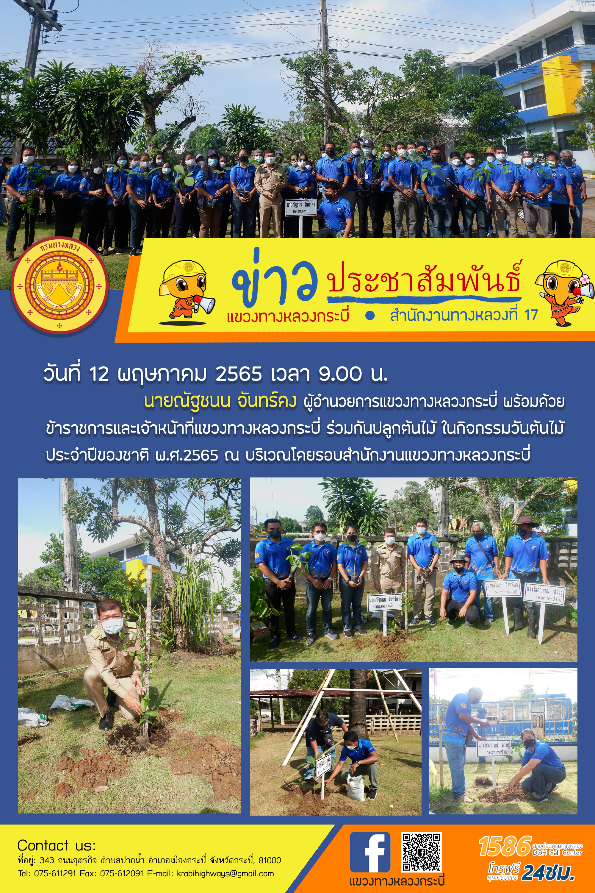 วันที่ 12 พ.ค. 2565 เวลา 09.00 น. นายณัฐชนน จันทร์คง ผู้อำนวยการแขวงทางหลวงกระบี่ พร้อมด้วยข้าราชการและเจ้าหน้าที่แขวงทางหลวงกระบี่ ร่วมกันปลูกต้นไม้ ในกิจกรรมวันต้นไม้ประจำปีของชาติ พ.ศ.2565 ณ บริเวณโดยรอบสำนักงานแขวงทางหลวงกระบี่