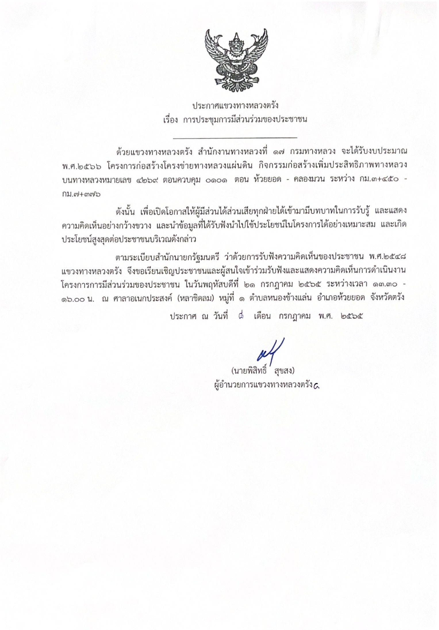 ขอเชิญเข้าร่วมประชุมการมีส่วนร่วมฯ ทล.4264 |