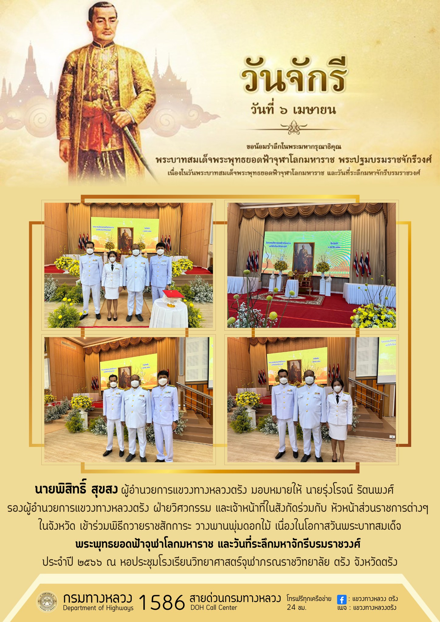 นายรุ่งโรจน์ รัตนพงศ์ รองผู้อำนวยการแขวงทางหลวงตรัง ฝ่ายวิศวกรรม และเจ้าหน้าที่ในสังกัดร่วมกับ หัวหน้าส่วนราชการต่างๆ ในจังหวัด เข้าร่วมพิธีถวายราชสักการะ วางพานพุ่มดอกไม้ เนื่องในโอกาสวันพระบาทสมเด็จพระพุทธยอดฟ้าจุฬาโลกมหาราช และวันที่ระลึกมหาจักรีบรมราชวงศ์ ประจำปี 2566 ณ หอประชุมโรงเรียนวิทยาศาสตร์จุฬาภรณราชวิทยาลัย ตรัง จังหวัดตรัง