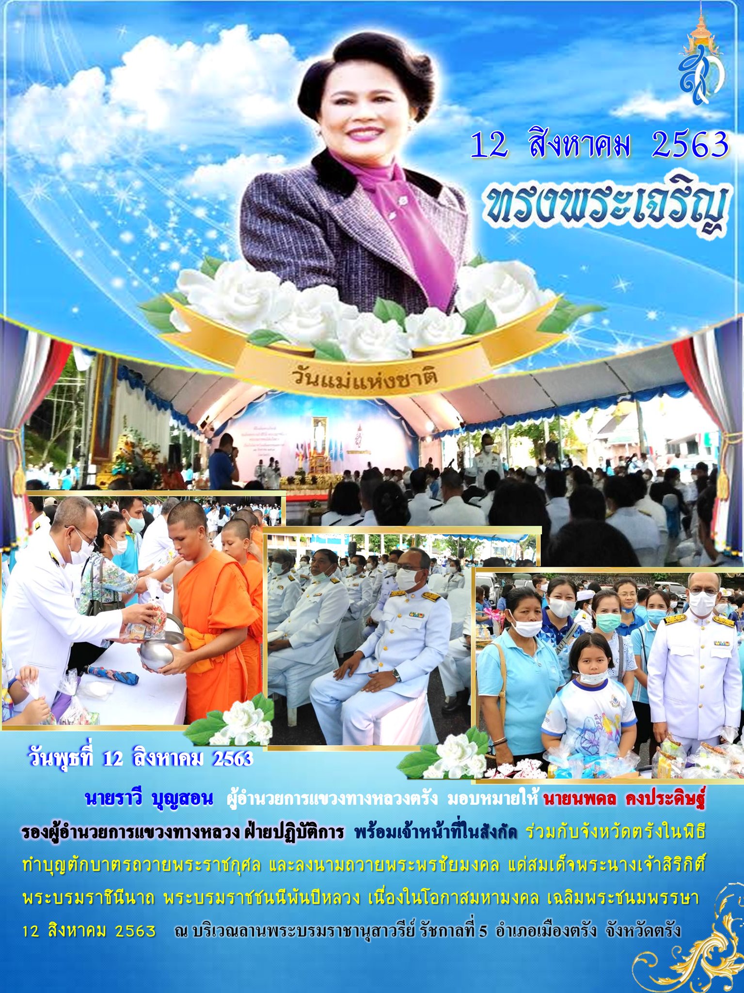 นายราวี บุญสอน ผู้อำนวยการแขวงทางหลวงตรัง มอบหมายให้ นายนพดล คงประดิษฐ์ รองผู้อำนวยการแขวงทางหลวง ฝ่ายปฏิบัติการ พร้อมเจ้าหน้าที่ในสังกัด ร่วมกับจังหวัดตรังในพิธีทำบุญตักบาตรถวายพระราชกุศล และลงนามถวายพระพรชัยมงคล แด่สมเด็จพระนางเจ้าสิริกิติ์ พระบรมราชินีนาถ พระบรมราชชนนีพันปีหลวง เนื่องในโอกาสมหามงคลเฉลิมพระชนมพรรษา 12 สิงหาคม 2563 ณ บริเวณลานพระบรมราชานุสาวรีย์ รัชกาลที่ 5 อำเภอเมืองตรัง จังหวัดตรัง