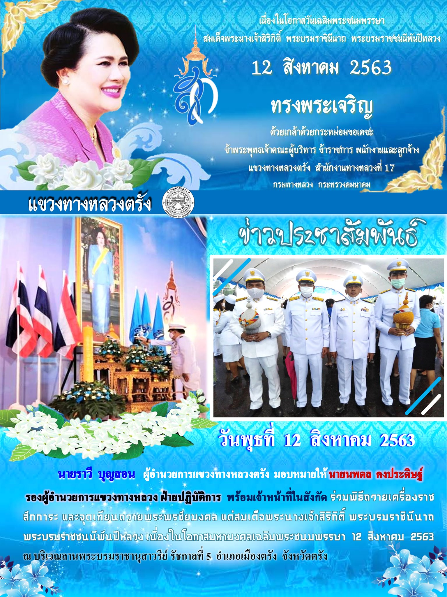 นายราวี บุญสอน ผู้อำนวยการแขวงทางหลวงตรัง มอบหมายให้ นายนพดล คงประดิษฐ์ รองผู้อำนวยการแขวงทางหลวง ฝ่ายปฏิบัติการ พร้อมเจ้าหน้าที่ในสังกัด ร่วมพิธีถวายเครื่องราชสักการะและวางพานพุ่ม และพิธีจุดเทียนถวายพระพรชัยมงคล แด่สมเด็จพระนางเจ้าสิริกิติ์ พระบรมราชินีนาถ พระบรมราชชนนีพันปีหลวง เนื่องในโอกาสมหามงคลเฉลิมพระชนมพรรษา 12 สิงหาคม 2563 ณ บริเวณลานพระบรมราชานุสาวรีย์ รัชกาลที่ 5 อำเภอเมืองตรัง จังหวัดตรัง