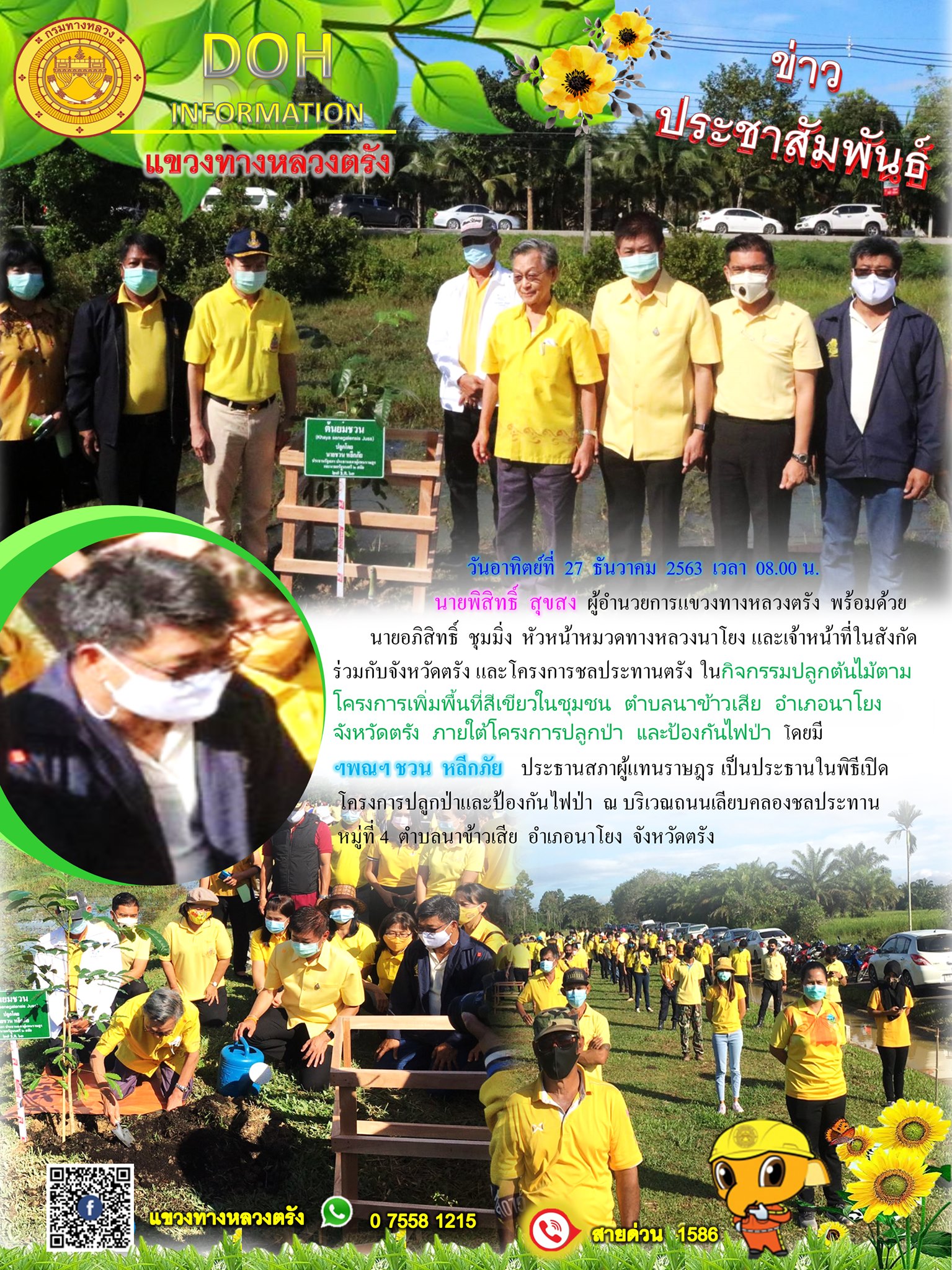 นายพิสิทธิ์ สุขสง ผู้อำนวยการแขวงทางหลวงตรัง พร้อมด้วย นายอภิสิทธิ์ ชุมมิ่ง หัวหน้าหมวดทางหลวงนาโยง และเจ้าหน้าที่ในสังกัด ร่วมกับจังหวัดตรัง และโครงการชลประทานตรัง ในกิจกรรมปลูกต้นไม้ตามโครงการเพิ่มพื้นที่สีเขียวในชุมชน ตำบลนาข้าวเสีย อำเภอนาโยง จังหวัดตรัง ภายใต้โครงการปลูกป่า และป้องกันไฟป่า โดยมี ฯพณฯ ชวน หลีกภัย ประธานสภาผู้แทนราษฎร เป็นประธานในพิธีเปิดโครงการปลูกป่าและป้องกันไฟป่า ณ บริเวณถนนเลียบคลองชลประทาน หมู่ที่ 4 ตำบลนาข้าวเสีย อำเภอนาโยง จังหวัดตรัง