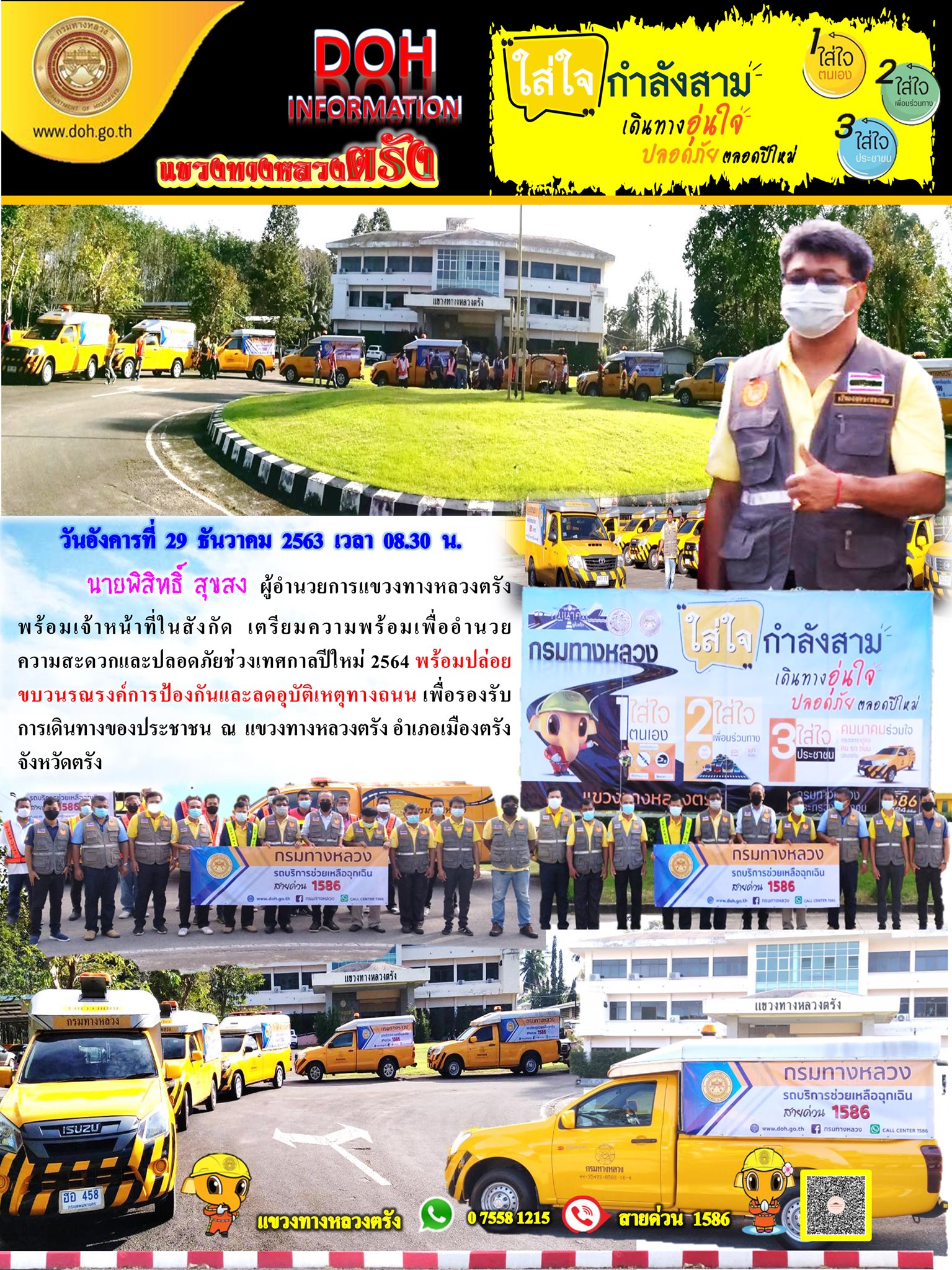 นายพิสิทธิ์ สุขสง ผู้อำนวยการแขวงทางหลวงตรัง พร้อมเจ้าหน้าที่ในสังกัด เตรียมความพร้อมเพื่ออำนวยความสะดวกและปลอดภัยช่วงเทศกาลปีใหม่ 2564 พร้อมปล่อยขบวนรณรงค์การป้องกันและลดอุบัติเหตุทางถนน เพื่อรองรับการเดินทางของประชาชน ณ แขวงทางหลวงตรัง อำเภอเมืองตรัง จังหวัดตรัง