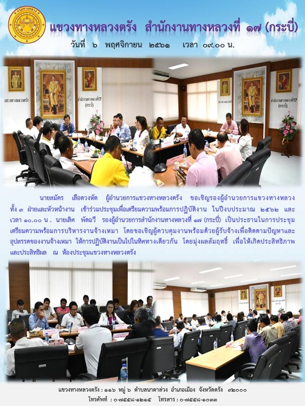 เวลา 09.00 น. นายสมัคร เลือดวงหัด ผู้อำนวยการแขวงทางหลวงตรัง ขอเชิญรองผู้อำนวยการแขวงทางหลวงทั้ง 3 ฝ่ายและหัวหน้างาน เข้าร่วมประชุมเพื่อเตรียมความพร้อมการปฏิบัติงาน ในปีงบประมาณ 2562