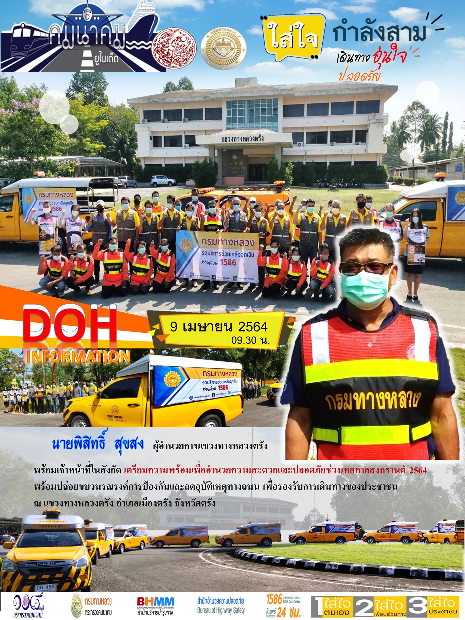 นายพิสิทธิ์ สุขสง ผู้อำนวยการแขวงทางหลวงตรัง พร้อมเจ้าหน้าที่ในสังกัด เตรียมความพร้อมเพื่ออำนวยความสะดวกและปลอดภัยช่วงเทศกาลสงกรานต์ 2564 พร้อมปล่อยขบวนรณรงค์การป้องกันและลดอุบัติเหตุทางถนน เพื่อรองรับการเดินทางของประชาชน ณ แขวงทางหลวงตรัง อำเภอเมืองตรัง จังหวัดตรัง