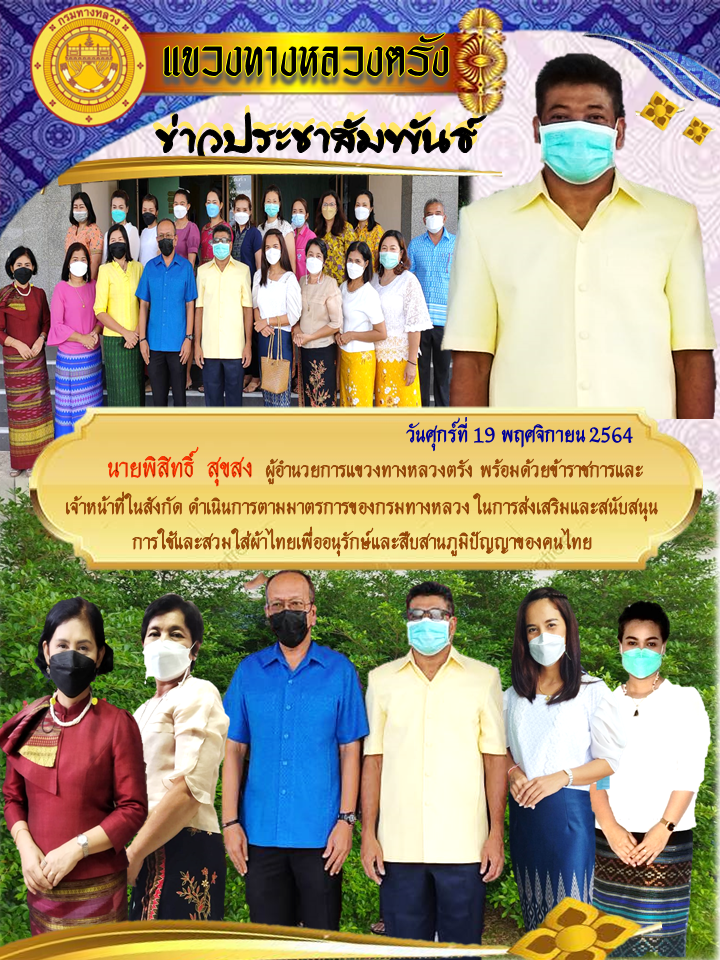 นายพิสิทธิ์ สุงสง ผู้อำนวยการแขวงทางหลวงตรัง พร้อมด้วยข้าราชการและเจ้าหน้าที่ในสังกัด ได้ร่วมดำเนินการตามมาตรการส่งเสริมและสนับสนุนการใช้และสวมใส่ผ้าไทย เพื่ออนุรักษ์และสืบสานภูมิปัญญาของคนไทย