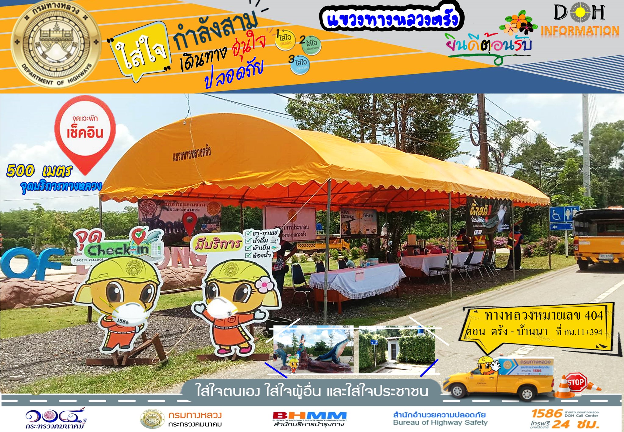 ซึ่งภายในจุดบริการจะมีเจ้าหน้าที่พร้อมให้บริการประชาชนผู้ใช้เส้นทาง ตลอด 24 ชั่วโมง อาทิ การให้ข้อมูลเส้นทาง แนะนำเส้นทางเลือก บริการน้ำดื่ม กาแฟ รวมทั้ง แอลกอฮอล์เจลล้างมือ หน้ากากอนามัย เพื่อป้องกันและควบคุมเชื้อไวรัส โควิด-19 พร้อมทั้งมีบริการห้องน้ำให้กับประชาชน ช่วงเทศกาลสงกรานต์ 2565 บนทางหลวงหมายเลข 404 ตอน ตรัง - บ้านนา ระหว่าง กม.11+349 - กม.11+469.500