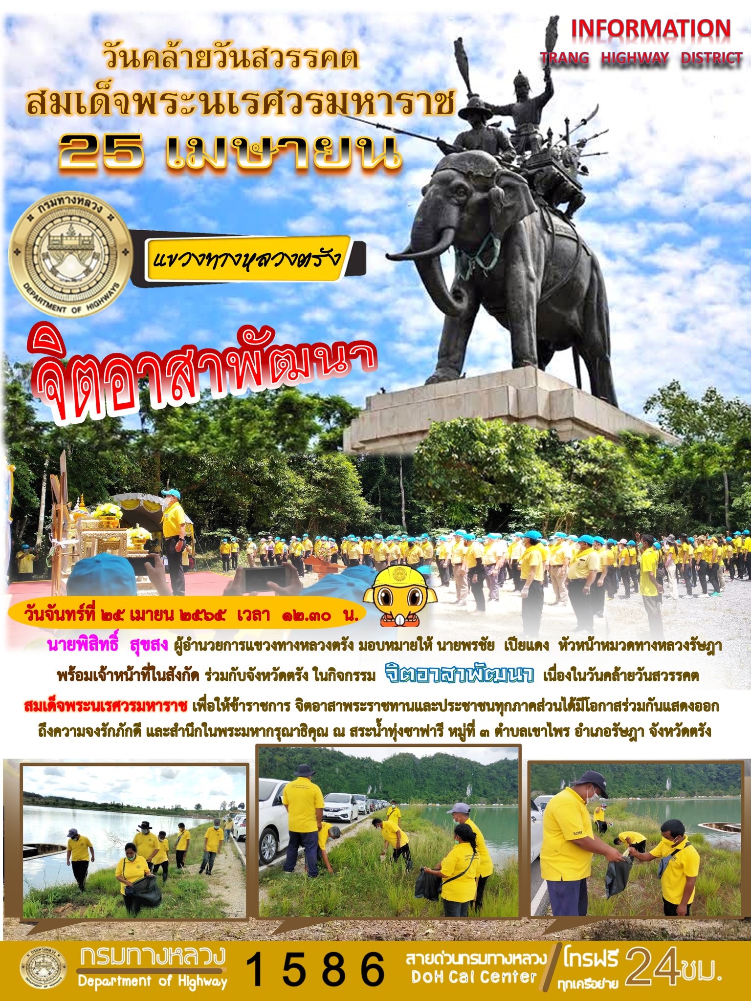 นายพิสิทธิ์ สุขสง ผู้อำนวยการแขวงทางหลวงตรัง มอบหมายให้ นายพรชัย เปียแดง หัวหน้าหมวดทางหลวงรัษฎา พร้อมเจ้าหน้าที่ในสังกัด ร่วมกับจังหวัดตรัง ในกิจกรรม จิตอาสาพัฒนาเนื่องในวันคล้ายวันสวรรคต สมเด็จพระนเรศวรมหาราช เพื่อให้ข้าราชการ จิตอาสาพระราชทานและประชาชนทุกภาคส่วนได้มีโอกาสร่วมกันแสดงออกถึงความจงรักภักดี และสำนึกในพระมหากรุณาธิคุณ ณ สระน้ำทุ่งซาฟารี หมู่ที่3 ตำบลเขาไพร อำเภอรัษฎา จังหวัดตรัง