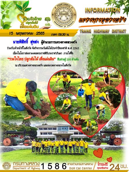 นายพิสิทธิ์ สุขสง ผู้อำนวยการแขวงทางหลวงตรัง ร่วมกับเจ้าหน้าที่ในสังกัด จัดกิจกรรมวันต้นไม้ประจำปีของชาติ พ.ศ. 2565 เนื่องในโอกาสมหามงคลพระราชพิธีบรมราชาภิเษก ภายใต้ชื่อ "รวมใจไทย ปลูกต้นไม้ เพื่อแผ่นดิน" สืบสานสู่ 100 ล้านต้น ณ บริเวณแขวงทางหลวงตรัง และหมวดทางหลวงในสังกัด