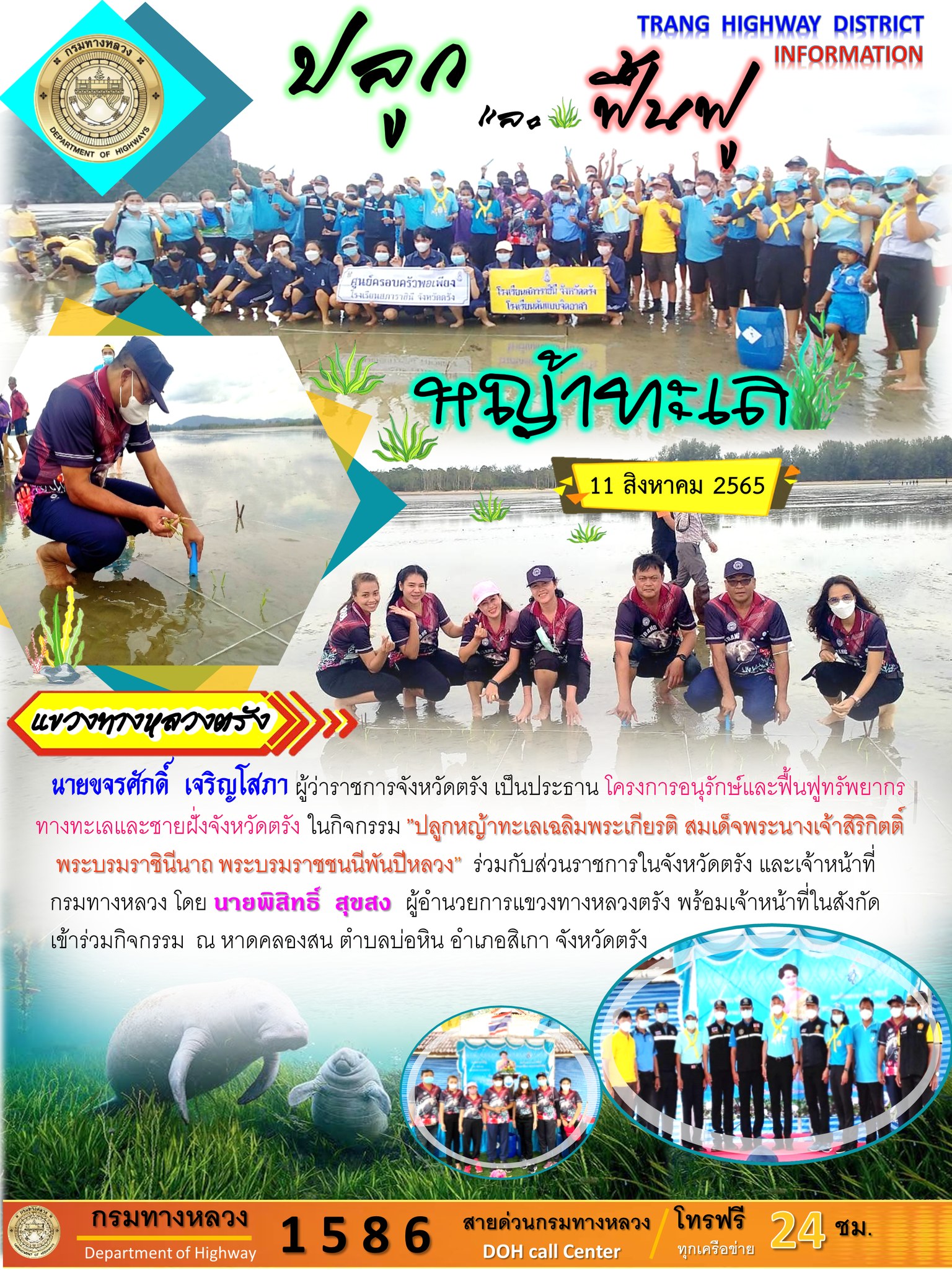 นายขจรศักดิ์ เจริญโสภา ผู้ว่าราชการจังหวัดตรัง เป็นประธาน โครงการอนุรักษ์และฟื้นฟูทรัพยากรทางทะเลและชายฝั่งจังหวัดตรัง เพื่อเป็นอาหารของพะยูน ในกิจกรรม "ปลูกหญ้าทะเลเฉลิมพระเกียรติ สมเด็จพระนางเจ้าสิริกิตติ์ พระบรมราชินีนาถ พระบรมราชชนนีพันปีหลวง" ร่วมกับส่วนราชการในจังหวัดตรัง และเจ้าหน้าที่กรมทางหลวง โดย นายพิสิทธิ์ สุขสง ผู้อำนวยการแขวงทางหลวงตรัง พร้อมเจ้าหน้าที่ในสังกัดเข้าร่วมกิจกรรม ณ หาดคลองสน ตำบลบ่อหิน อำเภอสิเกา จังหวัดตรัง
