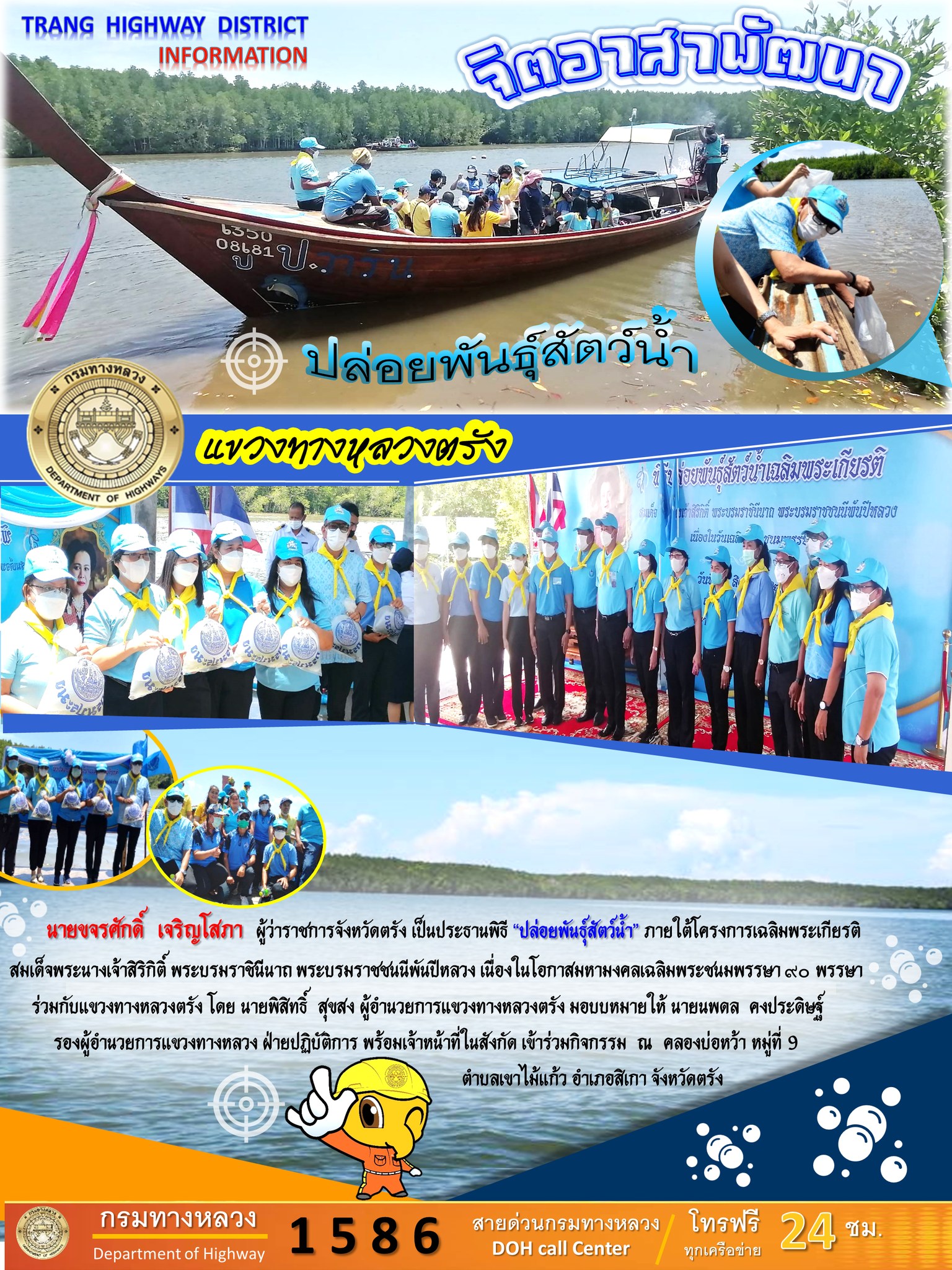 นายขจรศักดิ์ เจริญโสภา ผู้ว่าราชการจังหวัดตรัง เป็นประธานพิธี "ปล่อยพันธ์ุสัตว์น้ำ" ภายใต้โครงการเฉลิมพระเกียรติ สมเด็จพระนางเจ้าสิริกิติ์ พระบรมราชินีนาถ พระบรมราชชนนีพันปีหลวง เนื่องในโอกาสมหามงคลเฉลิมพระชนมพรรษา 90 พรรษา ร่วมกับแขวงทางหลวงตรัง โดย นายพิสิทธิ์ สุขสง ผู้อำนวยการแขวงทางหลวงตรัง มอบหมายให้ นายนพดล คงประดิษฐ์ รองผู้อำนวยการแขวงทางหลวง ฝ่ายปฏิบัติการ พร้อมเจ้าหน้าที่ในสังกัด เข้าร่วมกิจกรรม ณ คลองบ่อหว้า หมู่ที่ 9 ตำบลเขาไม้แก้ว อำเภอสิเกา จังหวัดตรัง